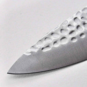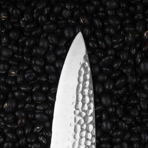 The Gyuto’s hybrid design combines the finesse of Japanese blades with the strength of German craftsmanship. Its slightly curved edge is ideal for a smooth rocking motion, making it perfect for chopping herbs or mincing garlic, while the lowered tip enhances precision for detailed tasks. The traditional Tsuchime (槌目) hammered pattern isn’t just beautiful—it reduces drag by creating air pockets, preventing food from sticking to the blade.