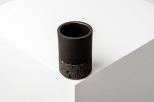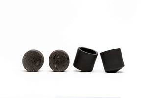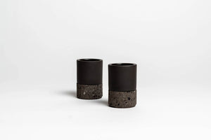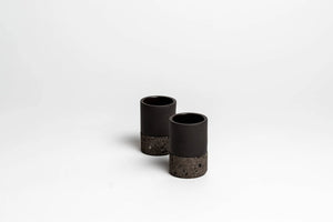 Two handcrafted black clay cups, each with a custom-fit black cantera stone base.